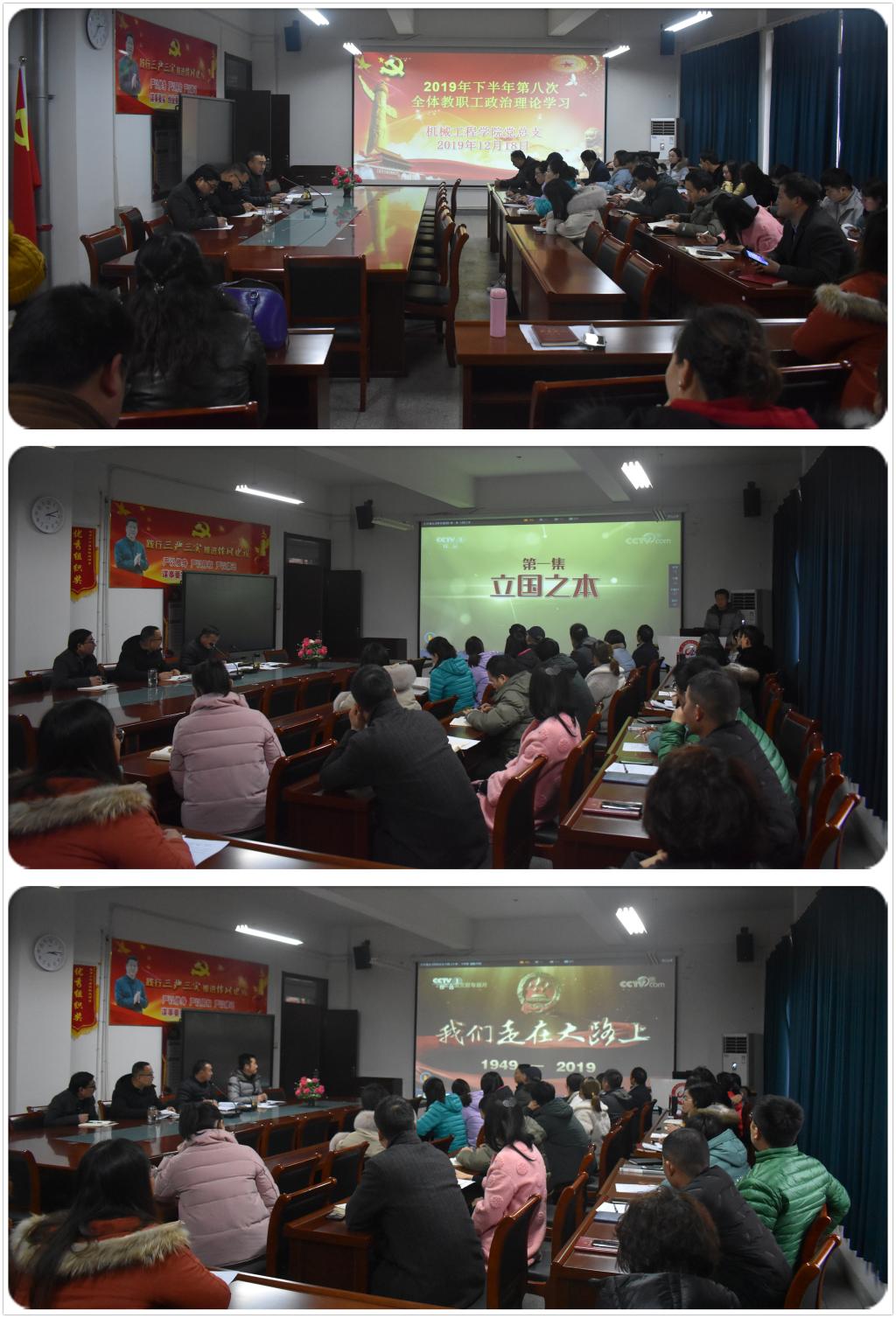 根据《BB贝博平台官网入口教职工政治理论学习制度(修订)》的通知(宣统〔2018〕4号)精神,结合机械工程学院全体教职工政治理论学习计划安排,12月18日下午,机械工程学院在6410会议室组织全体教职工观看教育纪录片《教育强国》和文献专题片《我们走在大路上》。