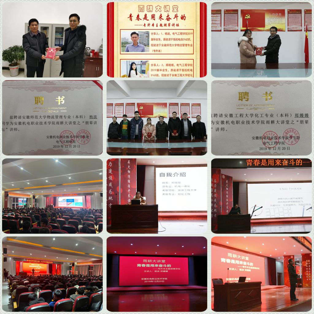 12月20日晚,由校学生处举办、电气工程学院承办的2019雨耕大讲堂之“青春是用来奋斗的”专升本主题朋辈讲坛教育实践活动在行政楼一楼报告厅顺利开讲。本次“朋辈讲堂”邀请的两位朋辈讲坛讲师安徽师范大学本科生杨波同学和安徽工程大学本科生郑嫚嫚同学为我校电气工程学院2019届毕业生。校学生处处长段贤勇、电气工程学院党总支书记余丙荣为两位同学颁发了“朋辈讲堂”讲师聘书。校学生资助管理中心主任赵勇、各二级学院专升本专项工作辅导员和学生代表参加了此次“朋辈讲坛”,讲坛由电气工程学院专升本专项工作辅导员石升起主持。