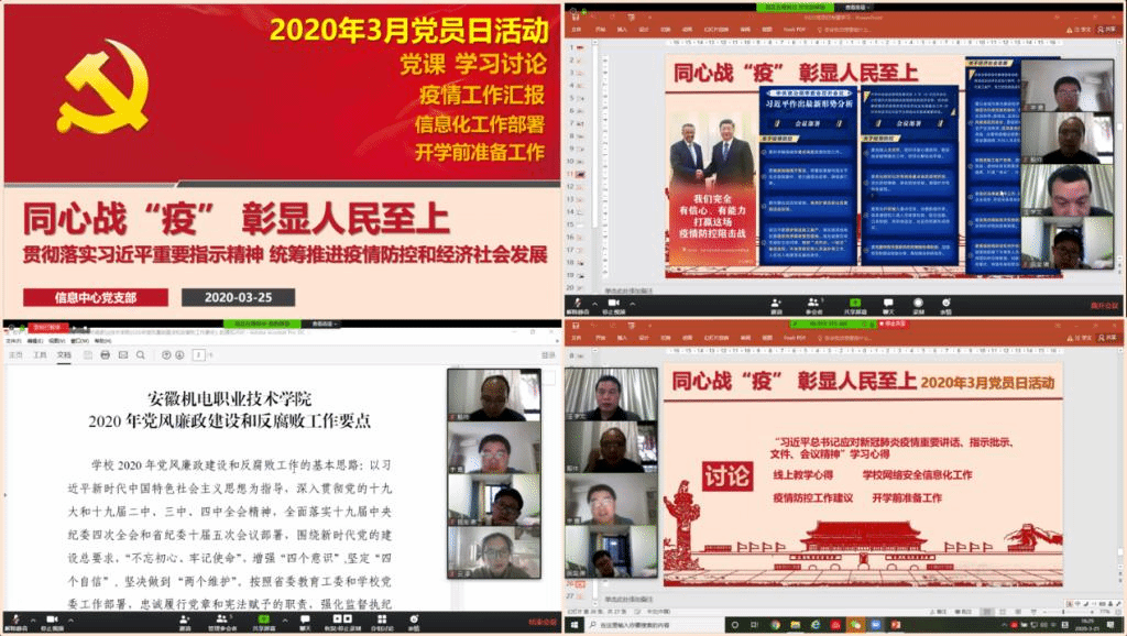 支部书记汪学文通过专题党课,与大家共同分析当前疫情防控形势,重点学习了3月18日中央政治局常委会会议精神和习近平总书记重要讲话,与大家分享了坚定共产党领导做到“两个维护”、以人民为中心、构建人类命运共同体等学习体会,向大家汇报了疫情期间信息化助力学校疫情防控的五大举措,并对开学前疫情防控和信息化工作做了工作部署。会上大家还共同学习了学校2020年党风廉政建设和反腐败工作要点和学校2020年工作要点。
