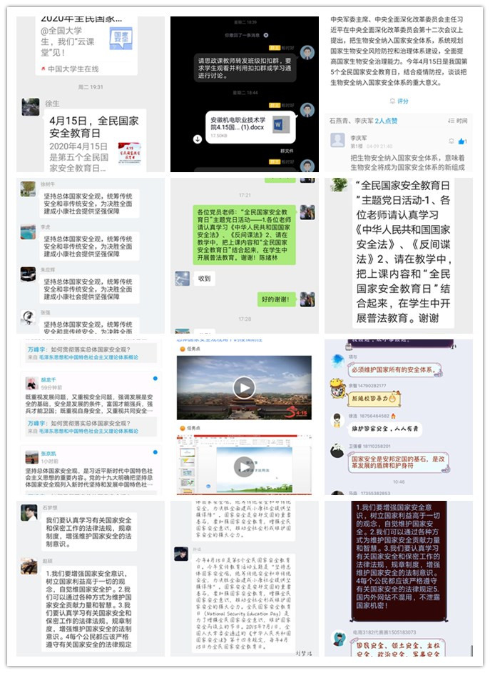 马克思主义学院利用教职工微信群、QQ群向全体教师传达了《BB贝博平台官网入口2020年国家安全教育日宣传活动方案》,提供了国家安全有关教育片、视频资料、国家安全教育宣传网络专栏链接网址、《中华人民共和国国家安全法》《中华人民共和国反间谍法》等学习材料,要求全体思政课教师加强自学,并积极利用班级QQ群、学习通等教学平台组织大学生开展学习讨论,切实增强国家安全意识,积极维护国家的安全和利益。