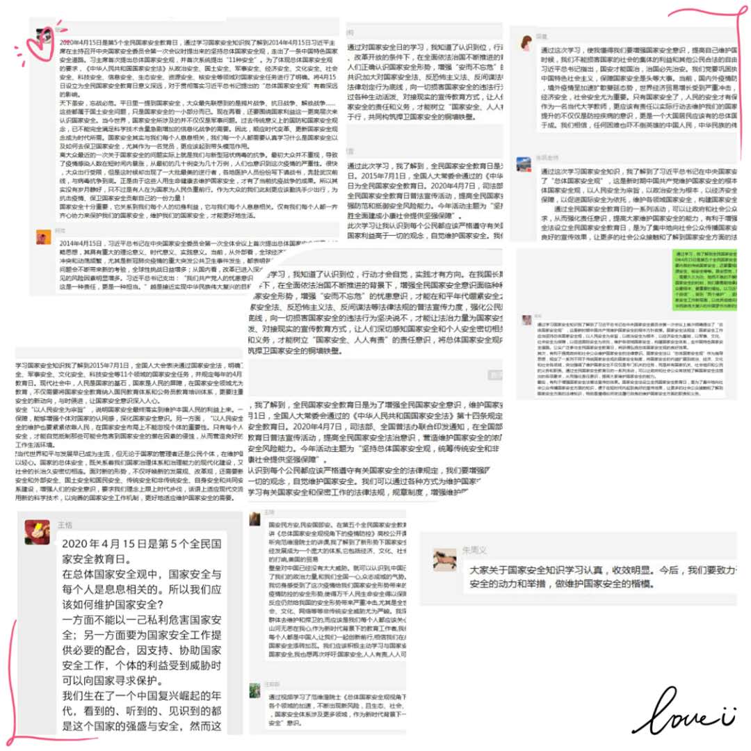 4月15日当天,财务处组织部门全体教职工线上观看了由清华大学公共安全研究院范维澄教授主讲的《总体国家安全观视角下的疫情防控》国家安全教育课,自主学习了由学校图书馆推送的国家安全知识问答等辅导内容,全面系统地了解了国家安全、总体国家安全观的内涵以及公民在维护国家安全中的权利等知识。学习之余,大家还结合个人思想和工作实际撰写学习心得,交流学习体会。